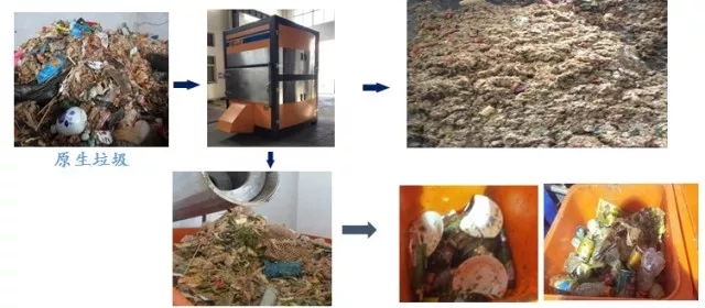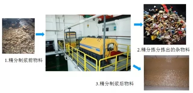 精分制漿機(jī)對(duì)物料進(jìn)行二次雜物分揀及破碎制漿,將物料中粒徑大小在20mm以上的雜物分離出系統(tǒng),如垃圾中的塑料、竹木、陶瓷、玻璃瓶、瓶蓋、筷子、骨頭以及貝殼等海鮮類硬物質(zhì)雜物,雜物外運(yùn)處理。同時(shí)對(duì)大塊有機(jī)質(zhì)進(jìn)行破碎得到以有機(jī)質(zhì)8mm以下粒度的漿狀物料為主的均質(zhì)物料。