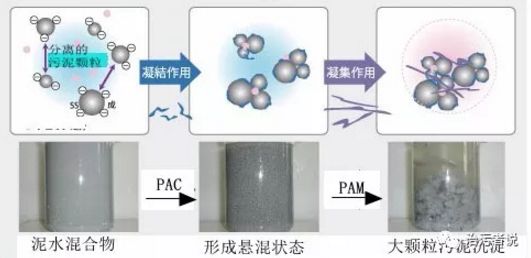 那么什么樣的化學(xué)藥劑可以作用到污泥中這些因素,并能夠?qū)崿F(xiàn)污泥中水分的去除呢?我們來了解一種化學(xué)藥劑,學(xué)名為聚丙烯酰胺,化學(xué)名稱的縮寫為PAM。PAM作為一種聚合藥劑,在水處理中的應(yīng)用廣泛,主要是對泥水混合物進(jìn)行有效的固液分離,從而實現(xiàn)污泥脫水的化學(xué)凝聚作用。對于PAM的制作和特性,在很多文獻(xiàn)中都有,不作為今天主要討論的內(nèi)容。今天就是來看PAM是怎樣實現(xiàn)對泥水混合物的固液分離的,我們來看看這一張圖。