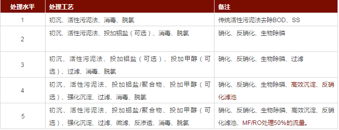 從上表中可以看到,對于TN<10mg/L以內的要求只是常規(guī)的硝化反硝化+生物除磷+過濾,可選擇性地投加化學除磷藥劑和外加碳源,并不包含反硝化濾池。反硝化濾池只用于處理水平4(TN<3mg/L)和處理水平5(TN<2mg/L)的要求。
