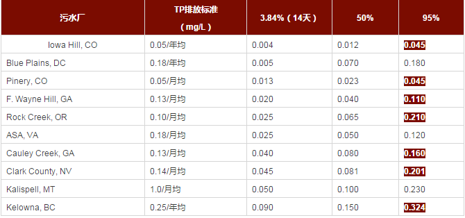 從上表中可以看出TPS-14d的值很低,都滿足排放標準,但這些數(shù)值只占3.84%。50%的中位值基本都滿足排放標準,95%的覆蓋率雖高,但有相當一部分數(shù)據(jù)并不滿足排放標準,TP的情況類似,如下表。
