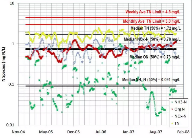 如果單獨對某個污水處理廠做一點深入的分析還會得到一些其他信息,WesternBranch污水處理廠的處理規(guī)模約12萬噸/日,出水TN月均值要求達到3mg/L,周均達到4.5mg/L,處理工藝采用三段式活性污泥法。