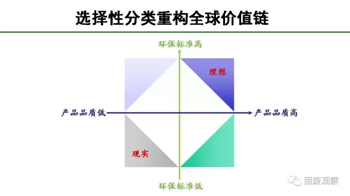 垃圾中的可回收物通常只能降級(jí)利用,產(chǎn)業(yè)集聚度和技術(shù)含量低,處于全球價(jià)值鏈的低端。如果我們僅把這些可回收物當(dāng)作資源來考慮,為什么發(fā)達(dá)國(guó)家將產(chǎn)業(yè)鏈最低端的可回收物出口到我們國(guó)家,這種不公平的全球價(jià)值鏈,我們應(yīng)該重構(gòu)!