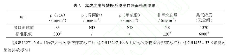 對于反應(yīng)釜、冷凝器出口的高濃度有機(jī)廢氣,改造方案先進(jìn)行水吸收或除塵預(yù)處理,再接入RTO爐,把異丙醇、甲硫醇等有機(jī)廢氣加熱到750~850℃,使廢氣中的有機(jī)物在氧化室氧化分解成CO2、SO2和H2O,最后經(jīng)一級堿吸收脫硫后排放。該工藝對異丙醇、甲硫醇等VOCs的凈化效率持久穩(wěn)定。焚燒系統(tǒng)出口(排氣筒高度25m)的檢測結(jié)果如表3所示,結(jié)果表明經(jīng)焚燒處理后,各類廢氣排放濃度、排放速率均達(dá)標(biāo)排放。系統(tǒng)設(shè)計風(fēng)量12000m3/h,總投資約182萬元,投運(yùn)后運(yùn)行費(fèi)用合計為5182元/天,其中天然氣費(fèi)1200元/天,電費(fèi)1152元/天,藥品費(fèi)2830元/天。