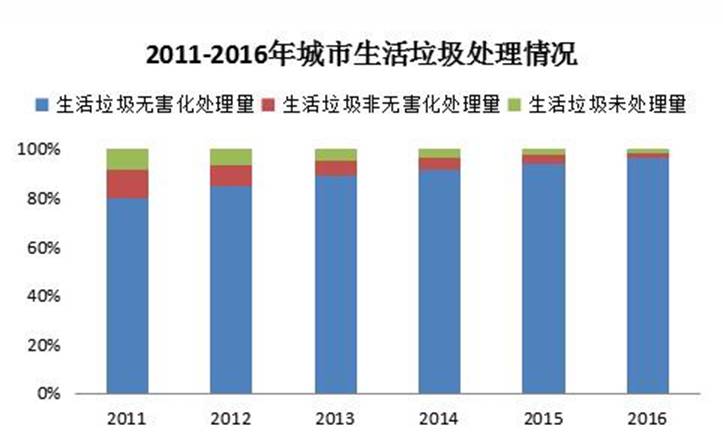 而在35%的要求之下,還存在著相當(dāng)高的生活垃圾處理率:《2017年全國(guó)大、中城市固體廢物污染環(huán)境防治年報(bào)》顯示,2016年,我國(guó)214個(gè)大、中型城市生活垃圾處理率達(dá)99.1%;《2016年城鄉(xiāng)建設(shè)統(tǒng)計(jì)公報(bào)》顯示,到2016年末,全國(guó)城市生活垃圾無(wú)害化處理率96.62%。