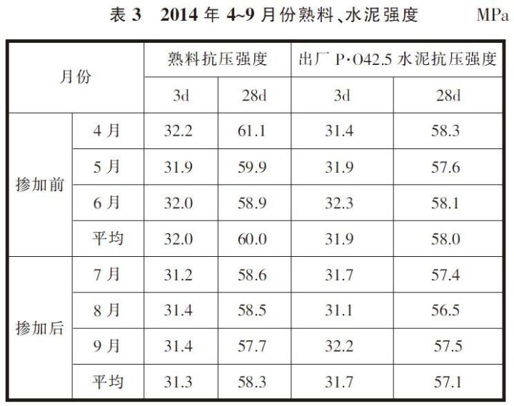 在生料中摻加污染土壤,造成生料易燒性的變化和有害成分的增加,對窯系統(tǒng)帶來一系列的不利影響,進(jìn)而導(dǎo)致熟料強(qiáng)度尤其是28d強(qiáng)度出現(xiàn)明顯下滑,同時對水泥強(qiáng)度尤其是28d抗壓強(qiáng)度造成一定影響,具體數(shù)據(jù)見表3。
