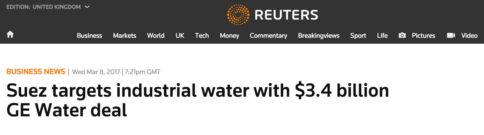 2017年3月8日 蘇伊士環(huán)境官網(wǎng)宣布,將聯(lián)合加拿大養(yǎng)老基金公司Caisse de dép?t et placement du Québec (CDPQ) 已與GE水處理 (GE Water & Process Technologies)達(dá)成綁定協(xié)議,以32億歐元的現(xiàn)金全資收購GE 水處理業(yè)務(wù)。此次收購預(yù)計(jì)在2017年中期結(jié)束,并獲取美國和歐盟相關(guān)機(jī)構(gòu)的批復(fù)。