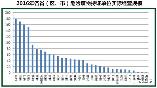 截至2016年,全國(guó)危險(xiǎn)廢物經(jīng)營(yíng)持證單位共2195家,核準(zhǔn)經(jīng)營(yíng)規(guī)模達(dá)到6471萬(wàn)噸,平均每家約2.9萬(wàn)噸。但實(shí)際經(jīng)營(yíng)規(guī)模為1629萬(wàn)噸,平均每家不足0.75萬(wàn)噸。實(shí)際經(jīng)營(yíng)規(guī)模排在前三位的分別是浙江、山東和廣東。