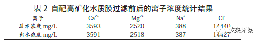 (2)膜過(guò)濾前后離子濃度變化研究。自配高礦化水通過(guò)膜過(guò)濾前后離子濃度變化情況見(jiàn)表2。