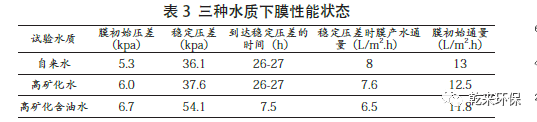 3.2 長(zhǎng)慶油田高礦化含油廢水對(duì)膜污染影響研究:反應(yīng)器中加入活性污泥,并同時(shí)進(jìn)行曝氣,分別以自來(lái)水、自配高礦化水、高礦化含油水(即高礦化/ 懸浮物水質(zhì))考察跨膜壓差及膜產(chǎn)水通量隨時(shí)間的變化。試驗(yàn)過(guò)程中使用同一個(gè)膜,污泥濃度為6 g/L,曝氣量為0.35 m3/h,水溫為14℃。測(cè)定自來(lái)水、自配高礦化水和高礦化含油水初始跨膜壓差、穩(wěn)定跨膜壓差、膜初始通量、穩(wěn)定膜產(chǎn)水通量見(jiàn)表3。