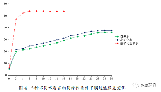 從表3 中可以看出,在蠕動(dòng)泵同樣抽吸的情況下,自來(lái)水、自配高礦化水和高礦化含油水三種水質(zhì)條件下,膜穩(wěn)定壓差依次增大,到達(dá)穩(wěn)定壓差時(shí)膜的產(chǎn)水通量依次減小,表明無(wú)機(jī)鹽類(lèi)離子、油類(lèi)物質(zhì)、機(jī)雜等均造成膜的孔徑堵塞,對(duì)膜產(chǎn)生污染影響。