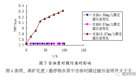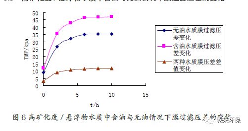 3.3 高礦化度/ 懸浮物水質(zhì)中含油與無(wú)油情況下膜過(guò)濾壓差的變化:圖6 表明,高礦化度/ 懸浮物水質(zhì)中含油時(shí)膜過(guò)濾壓差明顯大于無(wú)油的膜過(guò)濾壓差,并且壓差增長(zhǎng)數(shù)值逐漸增大,最大達(dá)到穩(wěn)定。說(shuō)明含油時(shí)水質(zhì)對(duì)膜污染影響較大。