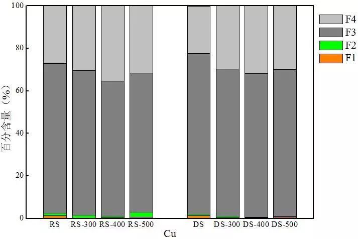 熱解后,兩種熱解炭中非穩(wěn)態(tài)Cu含量均有不同程度的降低,因此可以推斷經(jīng)過(guò)熱解后F1和F2態(tài)轉(zhuǎn)化為F3或F4態(tài)。在400 ℃熱解條件下熱解炭中穩(wěn)定態(tài)Cu含量最大,在500 ℃下熱解炭中殘?jiān)鼞B(tài)Cu相對(duì)于400 ℃會(huì)有小幅度降低,低溫對(duì)污泥中Cu的鈍化效果較佳。