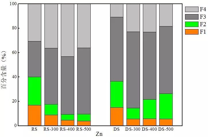 生污泥熱解炭隨熱解溫度升高,穩(wěn)定態(tài)含量增加,500 ℃下達(dá)到90.4%。而消化污泥熱解炭中Zn的穩(wěn)定態(tài)含量卻表現(xiàn)減小的趨勢(shì),在300 ℃熱解條件下穩(wěn)定態(tài)含量最大,為85.5%。兩種熱解炭中F3態(tài)金屬含量較原污泥均有大幅度的提升,以生污泥熱解炭為例,生污泥中F3態(tài)金屬含量為30%,而500 ℃下熱解炭中F3態(tài)金屬含量卻達(dá)到了54%。對(duì)比兩種熱解炭的重金屬分布可以發(fā)現(xiàn),消化污泥熱解炭中的非穩(wěn)態(tài)Zn含量高于生污泥熱解炭,但消化污泥熱解炭中F3態(tài)Zn含量卻顯著高于生污泥熱解炭,這可能也是厭氧消化后污泥中F3態(tài)Zn含量大幅度增加所導(dǎo)致。