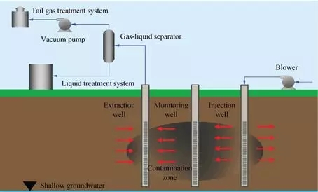 2.氣相抽提法:是去除非飽和區(qū)土壤中揮發(fā)性有機(jī)物的有效手段,通過(guò)注人井向滲流區(qū)注人空氣,同時(shí)利用抽提井產(chǎn)生低壓環(huán)境,使得土壤中存在于油相、溶解相以及吸附相的有機(jī)污染物揮發(fā)到氣相中,并經(jīng)抽提井收集到地面尾氣處理裝置中進(jìn)行回收或處理。