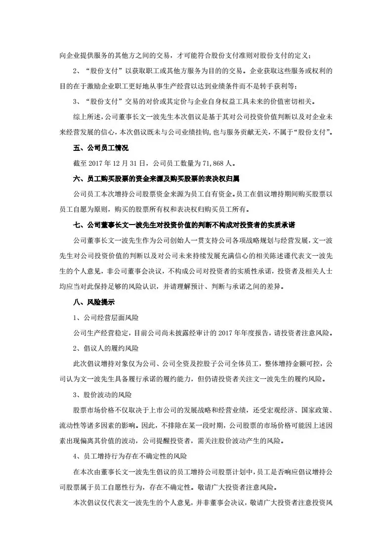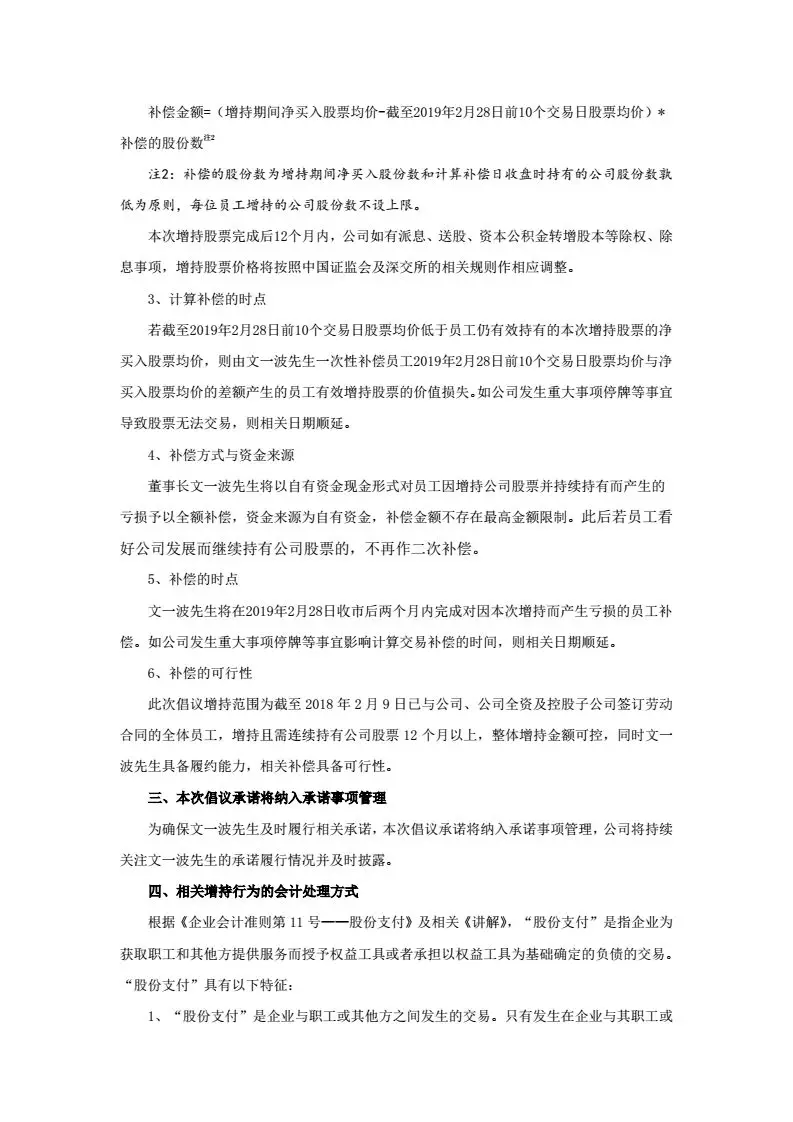 二、補(bǔ)償不設(shè)上限?!岸麻L(zhǎng)文一波先生將以自有資金現(xiàn)金形式對(duì)員工因增持公司股票并持續(xù)持有而產(chǎn)生的虧損予以全額補(bǔ)償,資金來(lái)源為自有資金,補(bǔ)償金額不存在最高金額限制。”換句話說(shuō)就是,虧多少,補(bǔ)多少,你虧,董事長(zhǎng)補(bǔ)!