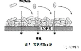 3.2膜面結(jié)晶:膜面結(jié)晶是RO 膜應(yīng)用的重要議題。按結(jié)晶理論,結(jié)晶狀態(tài)通??煞譃榱罱Y(jié)晶和膜面結(jié)晶。當溶液達到溶解度極限范圍時,分子相互碰撞產(chǎn)生晶體,晶體是不溶解的粒狀固體,隨水流方向壓到膜面上。粒狀晶體堆在膜面上比較松散,或隨著水流沖到濃液出口,因此粒狀結(jié)晶不會對膜通量帶來太大影響。粒狀結(jié)晶見圖3。