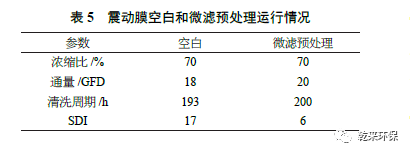 該項目震動膜空白和微濾預(yù)處理運行情況比較見表5。