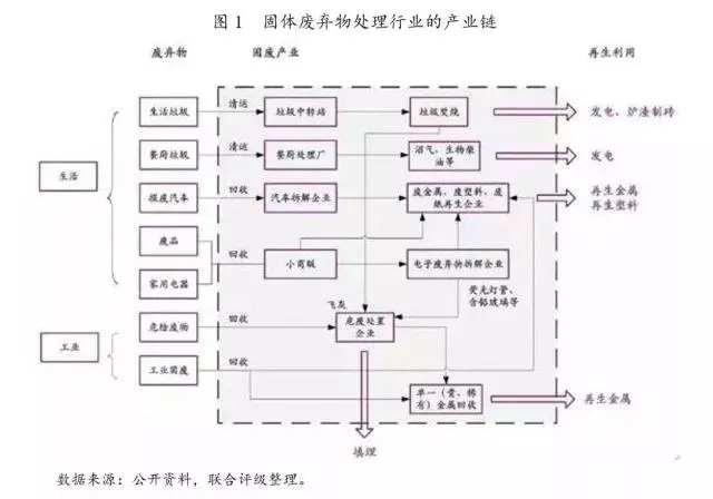 固體廢棄物主要來自于居民生活和工業(yè)生產(chǎn),數(shù)量巨大,品種繁多,要求相應(yīng)的處理手段嚴(yán)格,可重復(fù)利用程度較高。固體廢棄物通過填埋、焚燒、堆肥、回收利用或者循環(huán)再生方式進(jìn)行無害化處理。固體廢棄物處理行業(yè)的產(chǎn)業(yè)鏈如下圖所示。