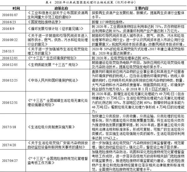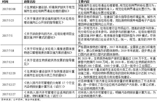 《“十三五”全國城鎮(zhèn)生活垃圾無害化處理設(shè)施建設(shè)規(guī)劃》助推垃圾焚燒發(fā)電行業(yè)快速發(fā)展;最新頒布的《國家危險(xiǎn)廢物名錄》對(duì)于危廢的識(shí)別更加清晰,危廢處理更加有據(jù)可循;《環(huán)境保護(hù)稅法》于2018年1日1日正式施行,“排污費(fèi)改稅”有利于引導(dǎo)排污單位減少污染物排放;《納入排污許可管理的火電等17個(gè)行業(yè)污染物排放量計(jì)算方法(試行)》和《未納入排污許可管理行業(yè)適用的排污系數(shù)、物料衡算方法(試行)》是全面細(xì)化和保障環(huán)保稅法實(shí)施的綜合性配套法規(guī),進(jìn)一步明確環(huán)保稅稅制要素。