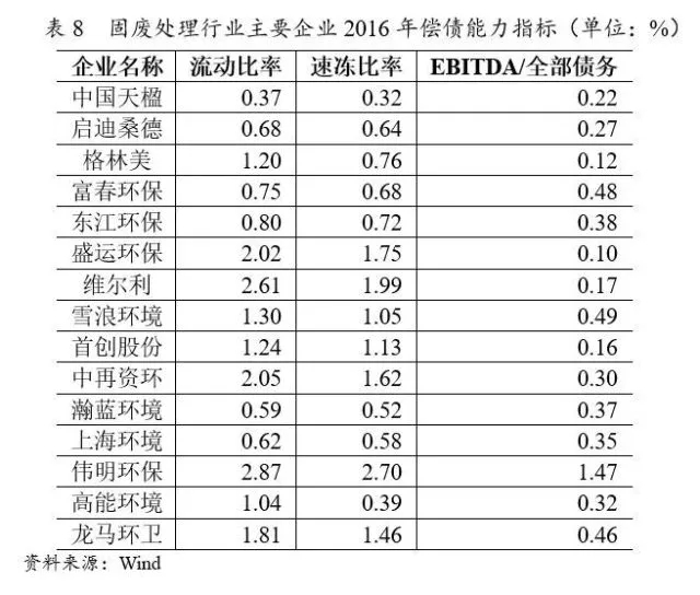 從長期償債能力指標(biāo)來看,2016年樣本企業(yè)EBITDA/全部債務(wù)中位數(shù)為0.32倍,其中偉明環(huán)保最高,為1.47倍,主要系其項(xiàng)目運(yùn)營業(yè)務(wù)銷售毛利率高導(dǎo)致盈利水平較高、且負(fù)債規(guī)模小所致;2016年樣本企業(yè)EBITDA/利息費(fèi)用的中位數(shù)為7.46倍,行業(yè)長期償債能力較強(qiáng)。