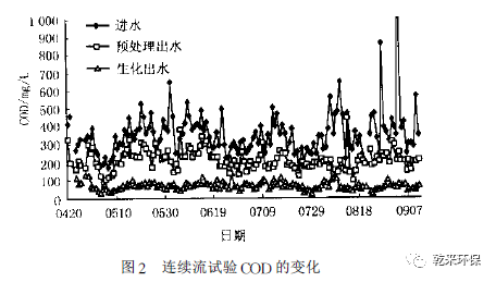 2. 4 連續(xù)流試驗(yàn)結(jié)果和討論:連續(xù)流試驗(yàn)在上海市某一工業(yè)區(qū)污水處理廠進(jìn)行。中試研究了催化還原內(nèi)電解工藝對(duì)該工業(yè)區(qū)污水處理廠主要污染成份的降解過(guò)程和降解效率,預(yù)處理段還原耗材鐵刨花的消耗量及對(duì)預(yù)處理效果的影響。