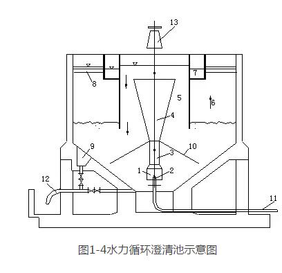 水、混凝劑和回流的泥渣在混合室和喉管內(nèi)快速、充分混合與反應(yīng)。混合后的水的流程與機(jī)械加速澄清池相似,即由第一反應(yīng)室→第二反應(yīng)室→分離室→集水系統(tǒng)。從分離室沉下來(lái)的泥渣大部分回流再循環(huán),少部分泥渣進(jìn)入泥渣濃縮室濃縮后排出池外。