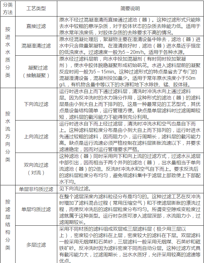 當(dāng)原水濁度低于150mg/L時(shí),也可以采用原水直接過(guò)濾或接觸混凝過(guò)濾。有的地下水,雖然濁度較低(一般在5mg/L以下),但為了除去鐵和錳等金屬化合物,常用接觸混凝或者錳砂過(guò)濾。(常見(jiàn)的過(guò)濾工藝的分類見(jiàn)下表1-2)。