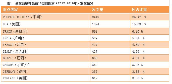 根據(jù)WOS檢索結(jié)果,全世界共有144國家或地區(qū)發(fā)表了土壤污染防治領(lǐng)域相關(guān)文獻(xiàn)。其中論文數(shù)量排名在前TOP10的國家(詳見表1)共發(fā)表了5760篇文獻(xiàn),占總量的63.25%。我國在論文數(shù)量上占有絕對的優(yōu)勢,2012年—2016年共發(fā)表論文2410篇,位居榜首。