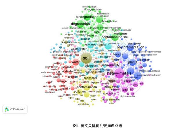 將webofscience上檢索到的9323條英文數(shù)據(jù)導(dǎo)入VOSviewer,共分析了491個關(guān)鍵詞,得出的高頻關(guān)鍵詞見表3。據(jù)統(tǒng)計,soil(土壤),heavy-metals(重金屬),出現(xiàn)頻次最高,可見重金屬的污染防治一直是領(lǐng)域的關(guān)注重點。degradation(退化)排名第四,反映出近5年來土壤退化問題備受關(guān)注。此外,植物修復(fù)和微生物修復(fù)也是近來的研究熱點。