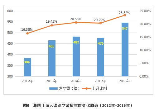 據(jù)統(tǒng)計,中國知網(wǎng)收錄的近5年土壤污染防治核心期刊文獻(xiàn)共2345篇,年度發(fā)文量總體呈上升趨勢(見圖6),上升率由2012年的16.38%升至2016年的23.32%,高出了6.94%,從年度論文數(shù)量的變化中可以看出我國學(xué)術(shù)界對土壤污染防治的關(guān)注度上升,說明我國科研人員越來越重視土壤污染防治的研究。
