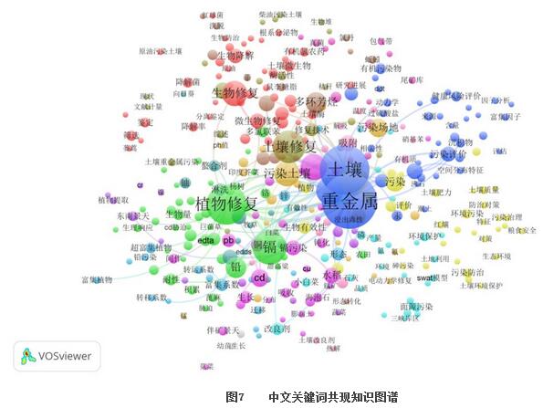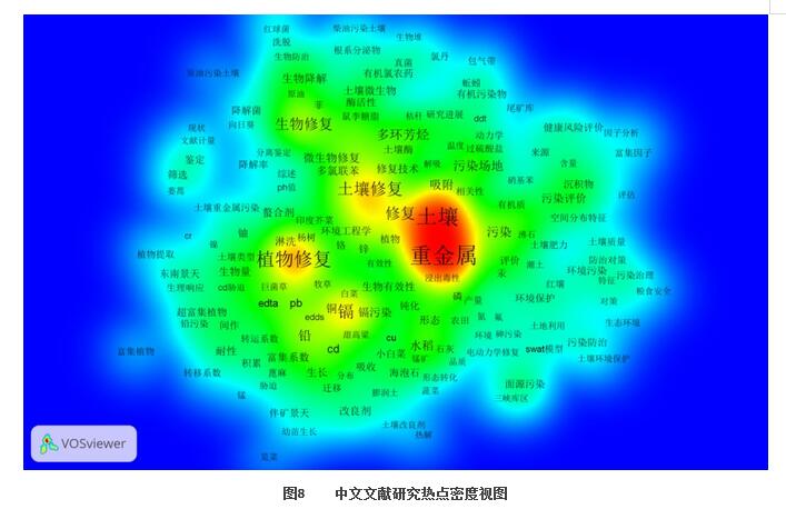 中文關(guān)鍵詞共現(xiàn)知識圖譜和熱點圖分別見圖7和圖8,可以發(fā)現(xiàn)該領(lǐng)域研究熱點集中在土壤重金屬防治技術(shù)研究,包括鎘、鉻、鋅、鉛、砷和汞及持久性有機污染物,特別是多環(huán)芳烴等的防治技術(shù)研究。在包含植物修復(fù)與微生物修復(fù)的生物修復(fù)技術(shù)研究方面熱度較高。