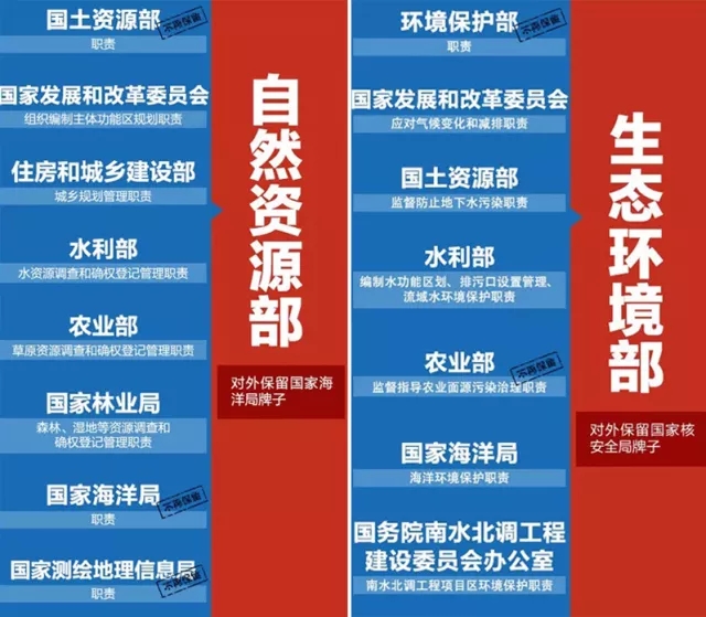 此次改革中,國土資源部改組為自然資源部,環(huán)境保護部改組為生態(tài)環(huán)境部,并且均擴充了許多新的職能,這是因應(yīng)生態(tài)文明戰(zhàn)略的具體行動。十九大報告提出,“加強對生態(tài)文明建設(shè)的總體設(shè)計和組織領(lǐng)導(dǎo),設(shè)立國有自然資源資產(chǎn)管理和自然生態(tài)監(jiān)管機構(gòu)”。