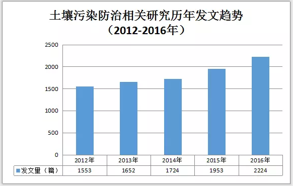 圖2土壤污染防治相關研究歷年發(fā)文趨勢(2012-2016)