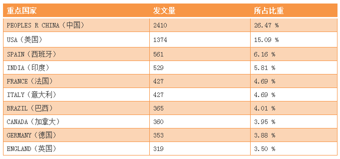 表1 論文數量排名前10位的國家(2012-2016年)發(fā)文情況