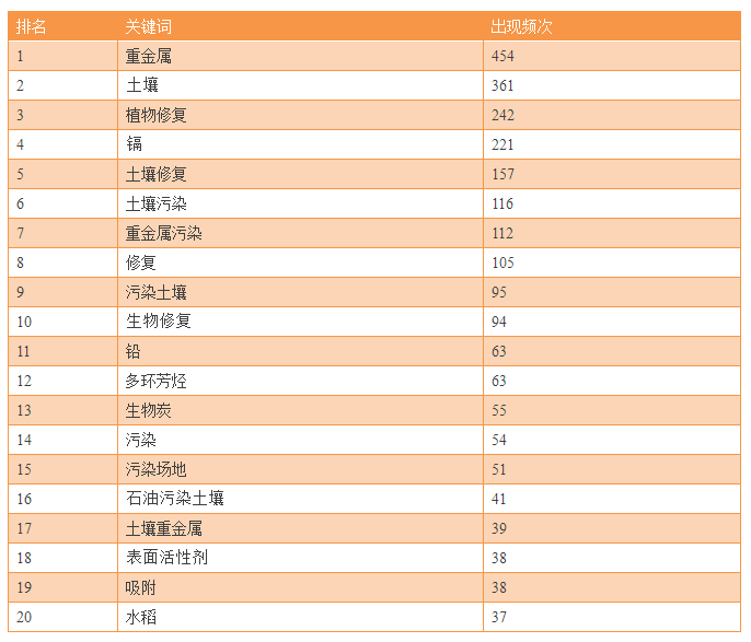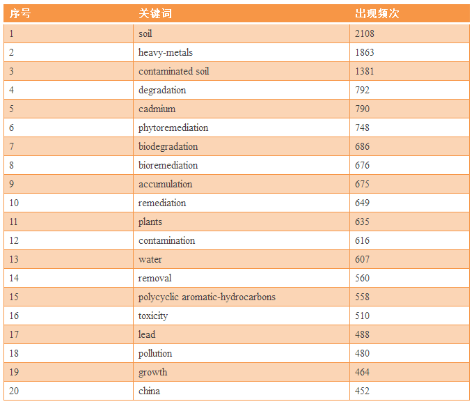 表6 土壤污染防治領域中文關鍵詞出現(xiàn)頻次信息(TOP 20)