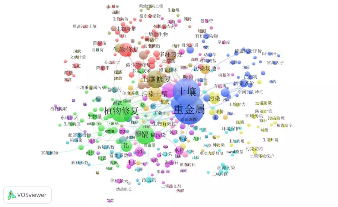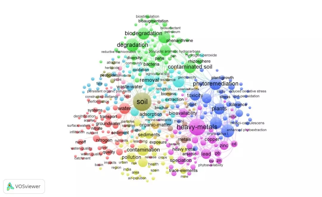 將web of science 上檢索到的9323條英文數據導入VOSviewer,共分析了491個關鍵詞,得出的高頻關鍵詞見表3。據統(tǒng)計,soil(土壤),heavy-metals(重金屬),出現(xiàn)頻次最高,可見重金屬的污染防治一直是領域的關注重點。degradation(退化)排名第四,反映出近5年來土壤退化問題備受關注。此外,植物修復和微生物修復也是近來的研究熱點。
