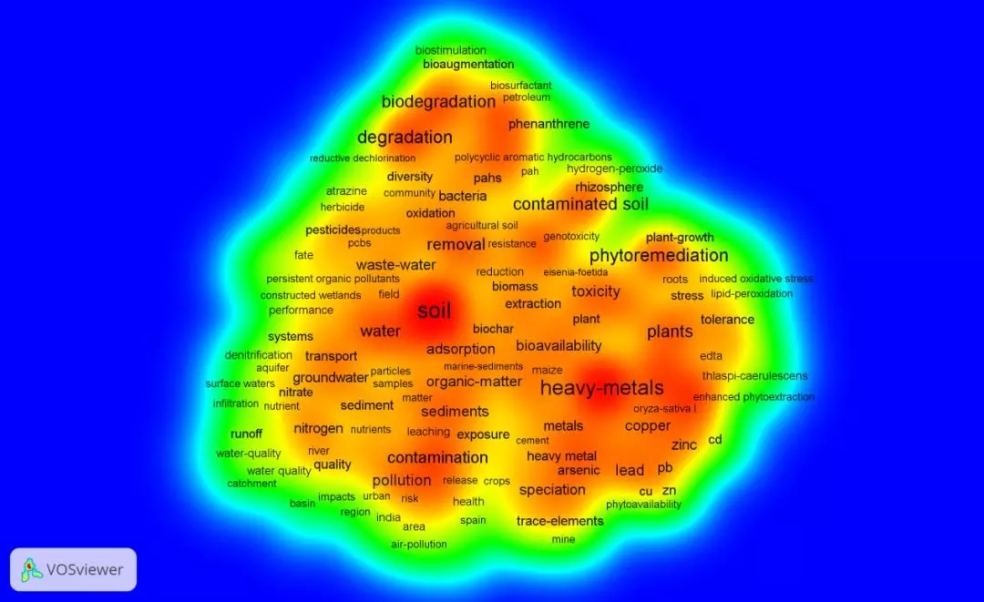 關鍵詞共現(xiàn)知識圖譜和熱點圖分別見圖4和圖5,可以發(fā)現(xiàn)該領域研究熱點集中于面源污染(water,nonpoint-source pollution)、重金屬防治(heavy-metals)、生物修復(biodegradation,bioremediation)、植物修復(plants,phytoremediation)、微生物修復(bacterial community)等方面,對比化學修復和物理修復,近幾年科學家們更關注綠色環(huán)保的生物修復技術,并出現(xiàn)了一些修復技術手段的交叉融合使用。在地域方面,發(fā)展中國家如中國和印度國家的土壤污染狀況受到更高的關注。