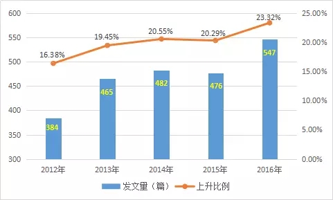 據統(tǒng)計,中國知網收錄的近5年土壤污染防治核心期刊文獻共2345篇,年度發(fā)文量總體呈上升趨勢(見圖6),上升率由2012年的16.38%升至2016年的23.32%,高出了6.94%,從年度論文數量的變化中可以看出我國學術界對土壤污染防治的關注度上升,說明我國科研人員越來越重視土壤污染防治的研究。
