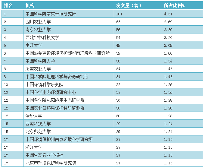 截至2016年發(fā)表的土壤污染防治相關研究論文中,發(fā)文量位居前20位的科研機構或單位見表5。中國科學院南京土壤研究所發(fā)文量101篇,以絕對性優(yōu)勢居榜首,四川農業(yè)大學以63篇發(fā)文居第二,南京農業(yè)大學以7篇之差位列第三。前20位的機構中,共有10所高校入圍,其中4所是農業(yè)類院校;科研機構有9個入圍??梢?,高校和科研機構是我國研究土壤污染防治的主力軍。