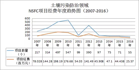 通過統(tǒng)計2007-2016十年內我國國家自然科學基金的項目數據,可知土壤污染防治領域的項目經費在2007-2010年呈穩(wěn)步上升趨勢,2010年申請通過的項目達峰值547個,2011年有所回落,2012年又激增到390個,之后幾年呈現(xiàn)了下降趨勢,2016年僅通過55個項目,經費也隨之下降,如圖9所示。