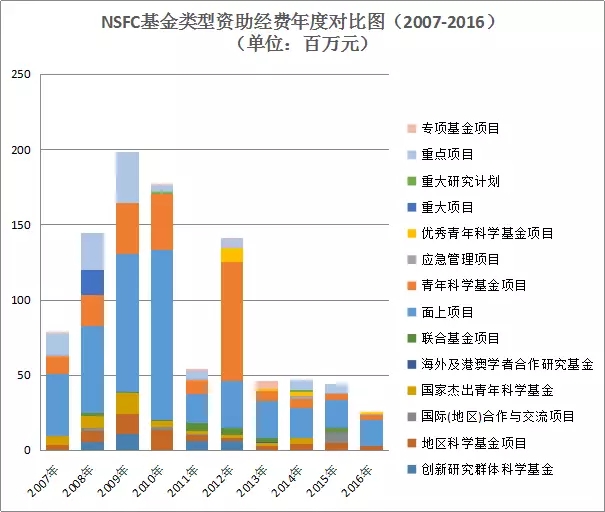 圖11 國家自然科學基金基金類型資助經費年度對比圖(2007-2016年)