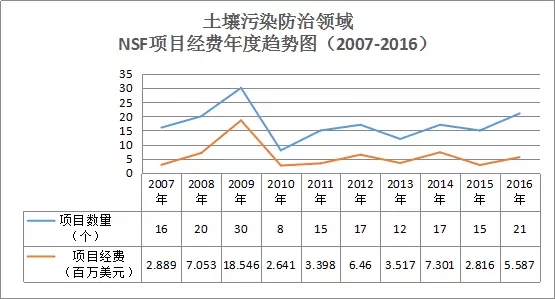 通過項目數據分析(見圖12),在土壤污染防治領域,美國國家科學基金資助經費在2007年至2009年呈現(xiàn)了穩(wěn)步遞增的趨勢,2009年項目數量達到峰值30個。2010年出現(xiàn)拐點,項目數量下降為8個,2011年又開始回升,之后5年一直較為平穩(wěn),2016年有所增加,達到21個。