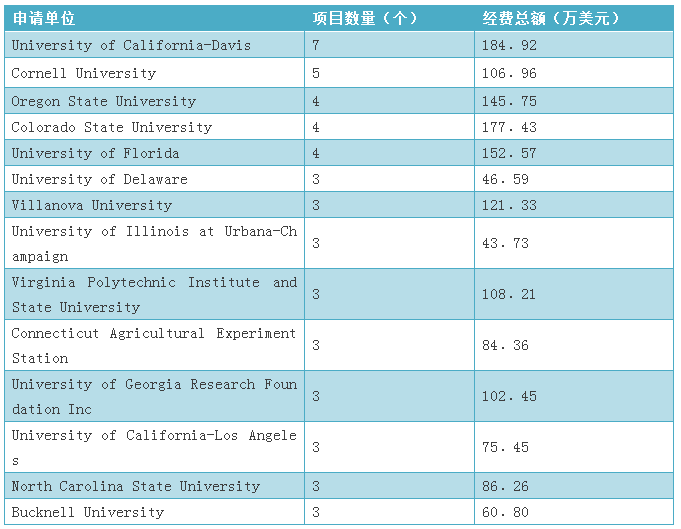根據統(tǒng)計,本領域申請年份在2007年至2016年間,共有135個機構申請了美國國家科學基金。其中申請數量超過2個的機構有14個獲得經費約為1496.8萬美元,如表9所示。