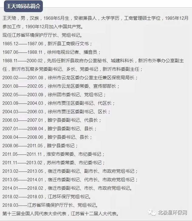 3月28日,江蘇省第十三屆人民代表大會常務(wù)委員會第二次會議通過,王天琦為江蘇省環(huán)境保護(hù)廳廳長。