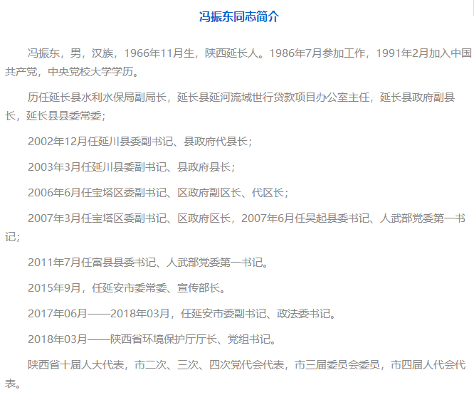3月31日,陜西省十三屆人大常委會第二次會議在西安舉行第二次全體會議。會議表決通過陜西省人大常委會決定任命名單,任命馮振東為陜西省環(huán)境保護(hù)廳廳長。