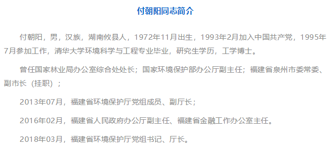 3月30日,福建省十三屆人大常委會第二次會議在福州舉行第三次全體會議。會議表決通過省人大常委會決定任命名單,任命付朝陽任福建省環(huán)境保護(hù)廳廳長。