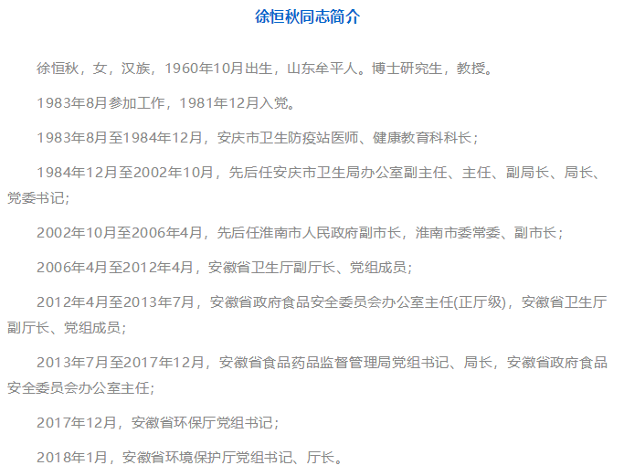 1月17日下午,安徽省第十二屆人民代表大會常務(wù)委員會第四十三次會議決定,任命徐恒秋為安徽省環(huán)境保護(hù)廳廳長。