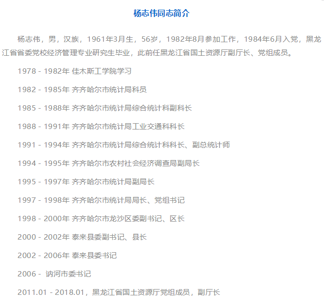 1月30日,黑龍江省第十三屆人民代表大會常務(wù)委員會第一次會議決定任命楊志偉為省環(huán)境保護(hù)廳廳長。