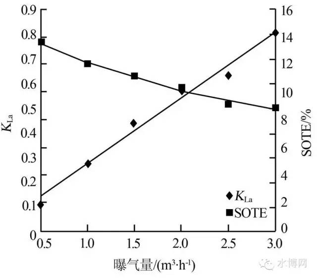 由圖2可知,KLa隨曝氣量的增加而逐漸增大。主要是因?yàn)槠貧饬吭酱螅瑲庖航佑|面積增大,充氧效率提高。另一方面,有研究者發(fā)現(xiàn)氧利用率隨曝氣量的增加而減小,本試驗(yàn)也發(fā)現(xiàn)了類似情況。這是因?yàn)樵谝欢ㄋ钕拢貧饬枯^小時(shí)增加了氣泡在水中的停留時(shí)間,氣液接觸時(shí)間延長;曝氣量較大時(shí)對(duì)水體擾動(dòng)較強(qiáng),大部分氧氣未有效利用,最終以氣泡形式從水面釋放到空氣中。本試驗(yàn)得出的氧利用率與文獻(xiàn)相比不高,可能是反應(yīng)器高度不夠,大量氧氣未與水體接觸便逸出,降低了氧利用率。