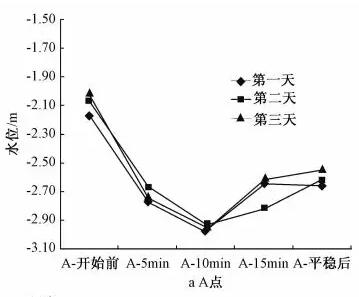 汛后試驗時,由于各點測水位和取樣的工作量太大,且受制于現(xiàn)場交通條件,因此在觀測點加裝了水位探頭,實時讀取數(shù)據(jù)。取樣則調(diào)整到調(diào)蓄池,在調(diào)蓄池蓄滿后,取池內(nèi)水樣送檢,然后實施放空作業(yè),每日重復(fù),直至試驗結(jié)束。